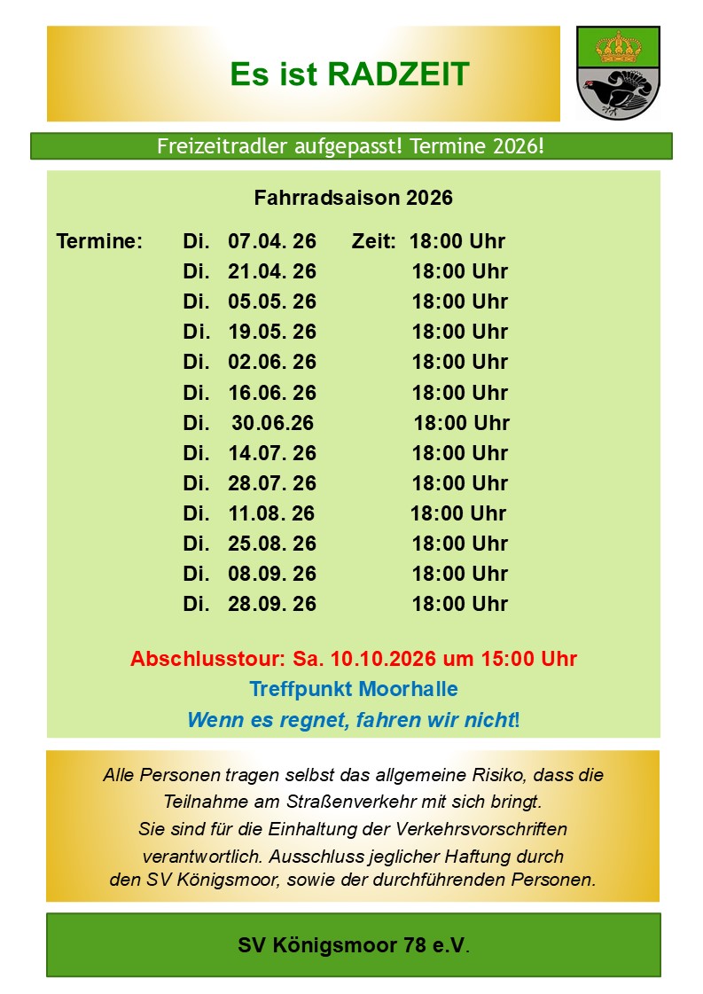 Die Termine werden im Schaukasten an der Moorhalle veröffentlicht. Termine 2026
